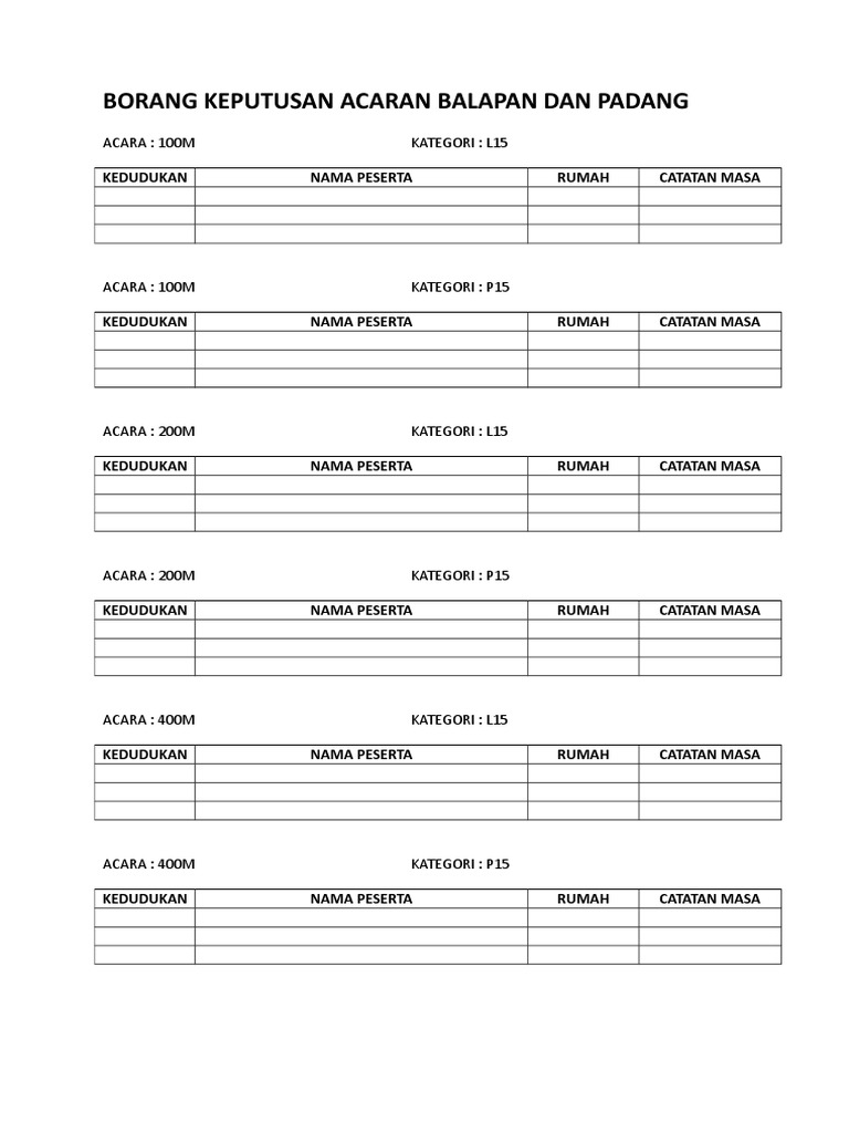 Jika dalam sukan bola sepak hanya satu pingat emas dijadikan rebutan dalam. Acara balapan padang acara 100 meter. A untuk ketinggian iaitu acara lompat tinggi dan lompat bergalah b untuk jarak jauh iaitu acara lompt jauh dan lompat kijang. Contoh contoh surat borang borang kejohanan serta pengisian majlis pembukaan dan penutupan.