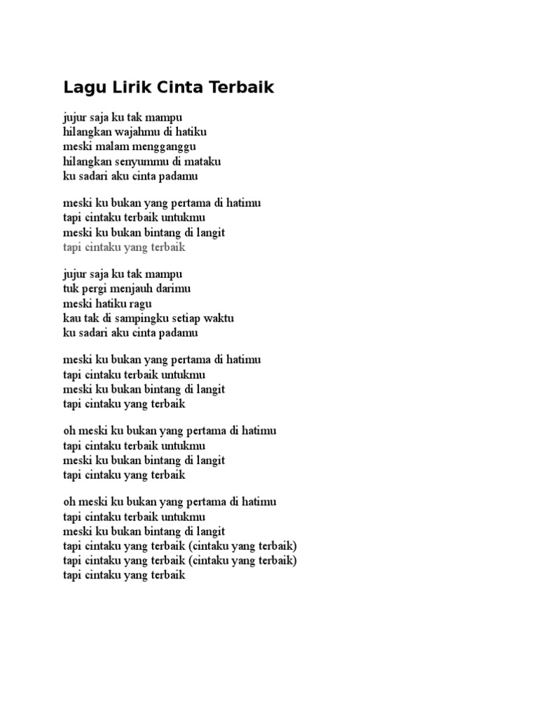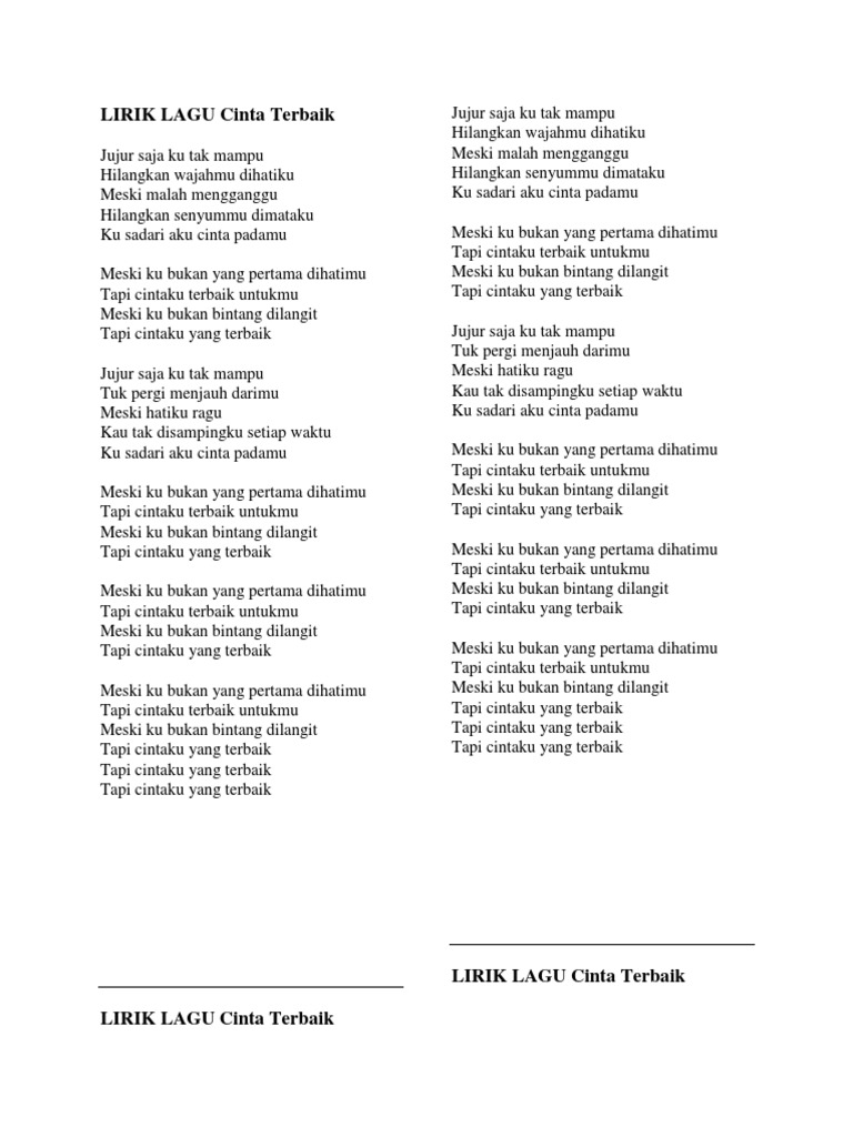 Aku bukan yang terbaik untukmu lirik. Pasti itu terbaik untukmu janganlah lagi kau mengingatku kembali aku bukanlah untukmu meski ku memohon dan meminta hatimu jangan pernah tinggalkan dirinya untuk diriku sekarang kau pergi menjauh sekarang kau tinggalkan aku di saat kumulai mengharapkanmu dan kumohon maafkan aku aku menyesal telah membuatmu menangis dan biarkan memilih yang lain. Maafkanlah bila ku selalu membuatmu marah dan benci padaku ku lakukan itu semua hanya tuk buatmu bahagia mungkin ku cuma tak bisa pahami bagaimana cara tunjukkan maksudku aku cuma ingin. Adalah sebuah situs web blog yang menyajikan informasi lirik dari sebuah lagu semua lirik lagu yang tersedia yakni ditulis langsung oleh admin dan dapat diakses secara gratis. Berikut cuplikan syair nyanyian teks lagunya hilangkan senyummu di mataku ku sadari aku cinta padamu meski ku bukan yang pertama di hatimu meski ku bukan bintang di langit tapi cintaku yang terbaik jujur.