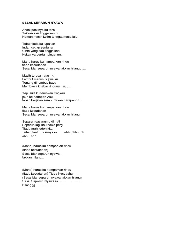 Andai pastinya ku tahu takkan aku tinggalkanmu namun masih keliru teringat masa lalu. Lirik lagu alyah ost satu hari tv9 sesal separuh nyawa andai pastinya ku tahu takkan aku tinggalkanmu namun masih keliru teringat masa lalu tetap tiada kulupakan indah setiap sentuhan cinta yang kau tinggalkan kekalnya berdampingan mana harusku hamparkan rindu tiada kesudahan sesal biar separuh nyawa takkan hilang masih terasa nafasmu. Sesal separuh nyawa artis. Andai pastinya ku tahu takkan aku tinggalkanmu namun masih keliru teringat masa lalu.