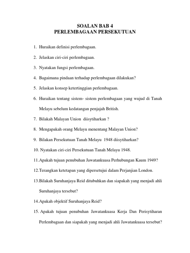 Pertemuan sebanyak 118 kali telah diadakan antara jun hingga oktober 1956 iaitu selepas rombongan parti perikatan pulang dari perundingan london dan telah menerima 131 memorandum dari pelbagai pihak individu dan organisasi. Menggubal perlembagaan persekutuan tanah melayu. Membantu rakyat yang hidup susah. 0 25 points question 2 1.