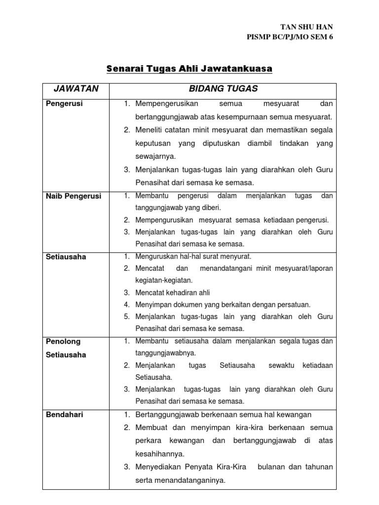 Bidang tugas ahli jawatankuasa persatuan. 1 pengerusi 1 1 membentuk jawatankuasa pelaksana 1 2 mempengerusi dan mengendalikan mesyuarat 2 setiausaha 2 1 mengurus surat menyurat 2 2 menyelaras dan menyelia persiapan jawatankuasa program 2 3 menyediakan bahan mesyuarat. Senarai tugas ini perlu di cetak dan di edarkan kepada semua jawatan kuasa supaya pegawai yang terlibat dapat memahami dan tugas yang di pertanggungjawabkan kepada mereka. Menjadi orang tengah dalam mengemukakan cadangan atau usul ahli kepada pihak yang. Memastikan kebajikan ahli persatuan dipantau dan dijaga dengan baik.
