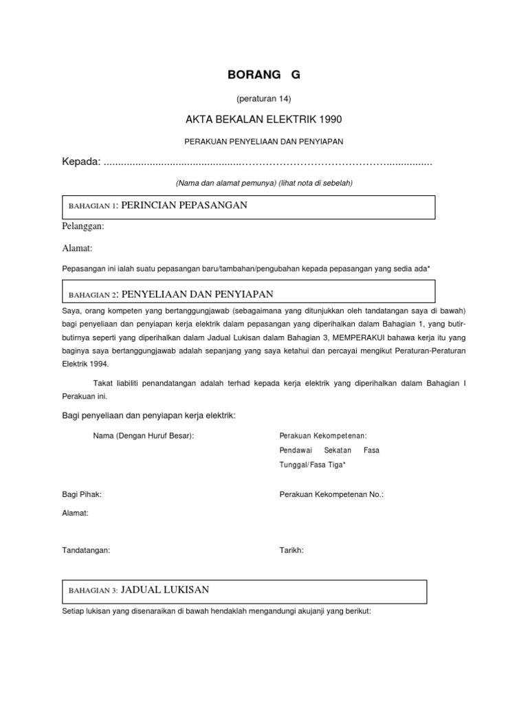 Dan penyiapan dan perakuan ujian borang g dan h dalam jadual pertama kepada pemegang lesen atau pihak berkuasa bekalan mengikut mana mana yang berkenaan bagi menerima elektrik daripada pemegang lesen atau pihak berkuasa bekalan. Borang g borang h posted by unknown at 6 30 pm. Berdasarkan borang h lah bayaran pampasan akan dibuat. Borang photocopy boleh.