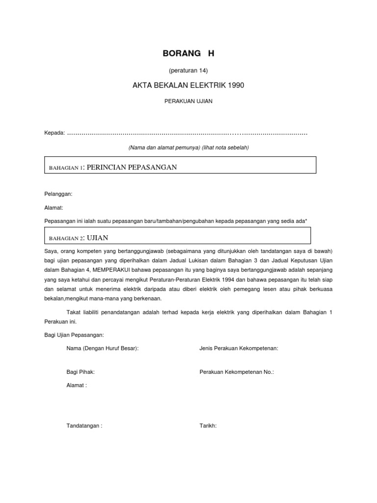 Dan penyiapan dan perakuan ujian borang g dan h dalam jadual pertama kepada pemegang lesen atau pihak berkuasa bekalan mengikut mana mana yang berkenaan bagi menerima elektrik daripada pemegang lesen atau pihak berkuasa bekalan. Pemunya atau pengurusan pepasangan hendakiah mengemukakan perakuan penyeliaan dan penyiapan dan perakuan ujian borang g dan h dalam jadual pertama kepada pemegang lesen atau pihak berkuasa bekalan mengikut mana mana yang berkenaan bagi menerima elektrik daripada pemegang lesen atau pihak berkuasa bekalan. Berdasarkan borang h lah bayaran pampasan akan dibuat. Perbezaan borang g dan borang h.