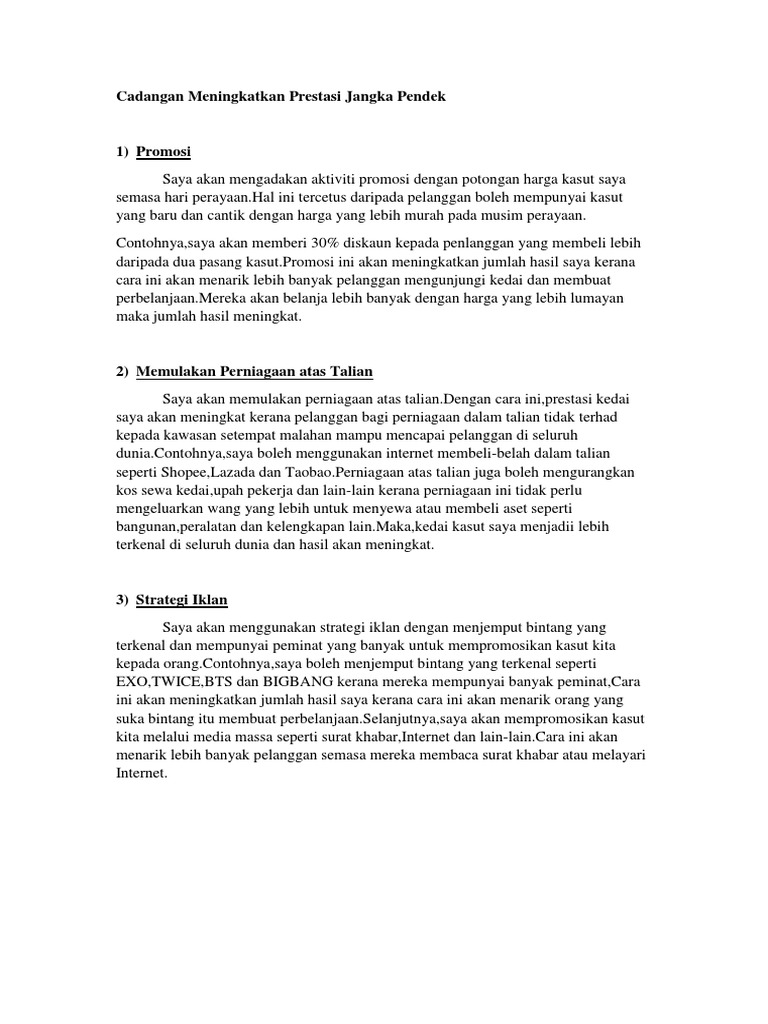 Cadangan jangka pendek perniagaan kasut. Mula merangka pelan perniagaan jangka pendek dan jangka panjang. 2 menukarkan bentuk perniagaan daripada milikan tunggal kepada perkongsian atau syarikat sdn. Kerana kita membuka perniagaan bukan untuk tempoh sebulan sahaja. Bagaimana perniagaan ini boleh berkembang dalam masa setahun tiga tahun dan lima tahun.