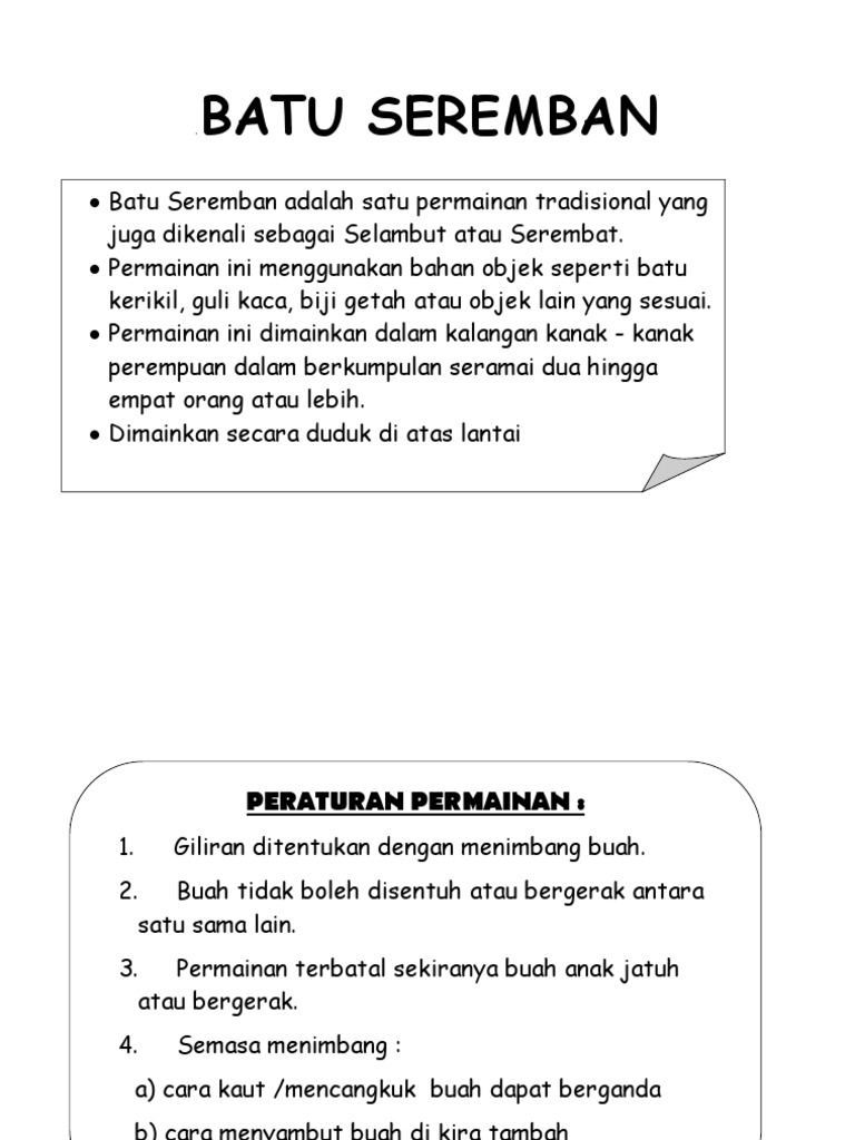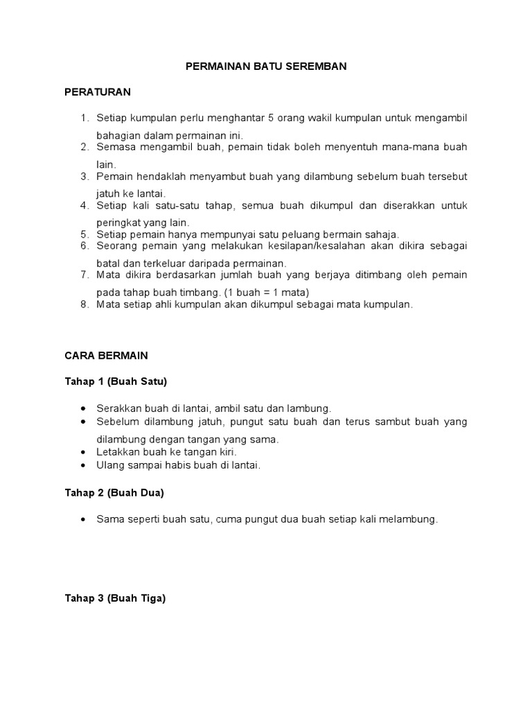 Asal usul batu seremban batu serembat juga dikenali sebagai batu selambut atau serembat. Cara bermain batu seremban 1. Jahit tepi dan bawah tinggalkan satu bahagian terbuka. Lambung seketul batu seremban ke atas sambil mengambil seketul batu seremban di bawah.