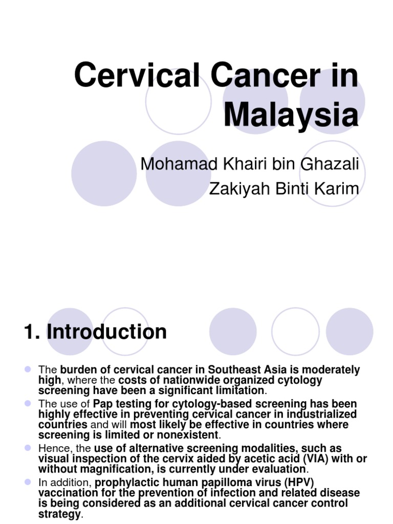To minimise cancer in malaysia by raising public awareness on the prevention screening and early detection of cancer through education. 2007 2011 ministry of health malaysia 621 deaths. To achieve the cervical screening targets malaysia will now have to phase in the new guidelines for primary hpv testing in cervical cancer screening in malaysia. Cervical cancer is the third most common cancer in malaysia and is the easiest gynecological cancer to prevent with regular pap smear tests hpv vaccinations and follow ups.