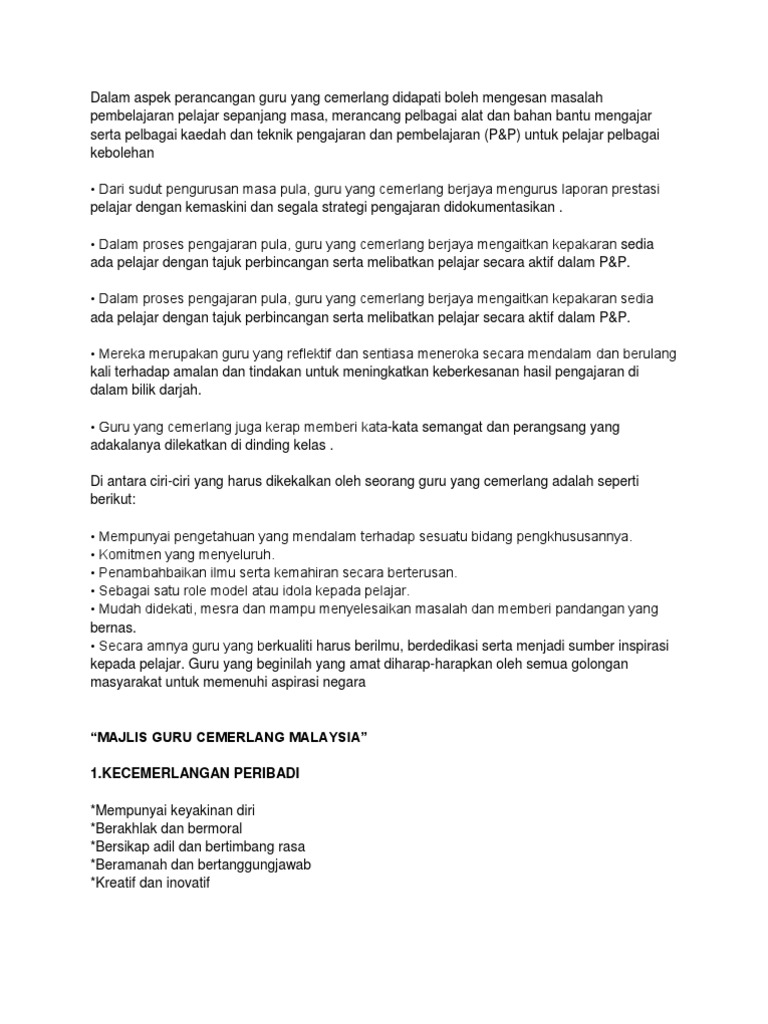 Di antara ciri ciri yang harus dikekalkan oleh seorang guru yang cemerlang adalah seperti berikut. Antara ciri ciri guru berkesan dari segi peribadi yang paling banyak dikaitkan dengan pencapaian pelajar ialah kemesraan dan sikap memahami. Urus setia guru cemerlang jemaah nazir sekolah 2003. 14 tahun 2005 tentang guru dan dosen uugd pasal 10 ayat 1 ciri ciri guru profesional sebagai berikut.