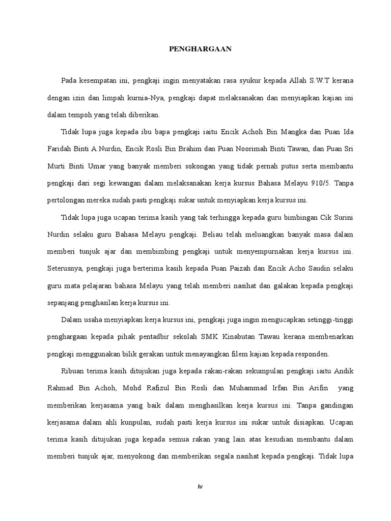 Sebagai contoh penggunaan bahasa kasar tidak dibenarkan. 3 0 isi isu yang dilaporkan 3 1 3 2 mesti ada subtajuk 3 3 4 0 cadangan langkah 4 1 4 2. 1 senarai kandungan penghargaan 2 1 0 pengenalan 3 1 1 latar belakang 3 1 2 definisi konsep 4 2 0 objektif kajian 4 3 0 kepentingan kajian 4 4 0 skop kajian 5 5 0 batasan kajian 5 6 0 kaedah kajian 5 6 1 pengumpulan data 5 6 2 penganalisisan data 6 7 0 dapatan kajian 6 7 1 senarai ragam bahasa 6 7 2 fungsi ragam bahasa 11 8 0 rumusan kajian 16 9 0.