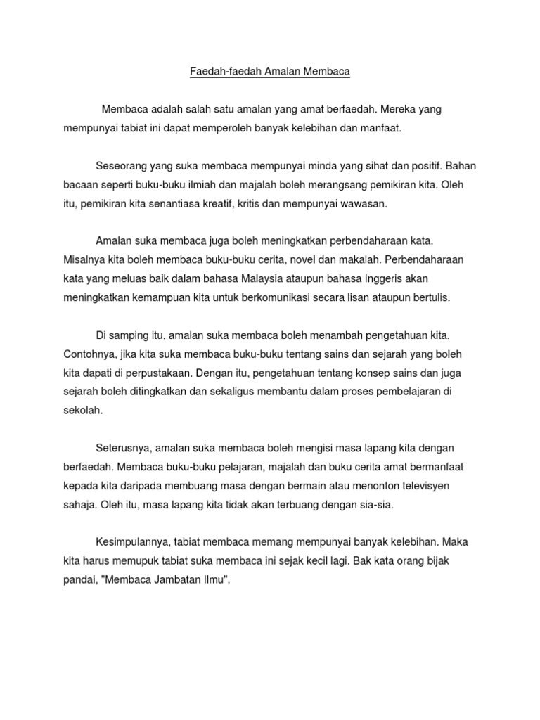 Faedah membaca amalan membaca merupakan satu amalan yang mulia. Dalam beberapa ungkapan peribahasa banyak juga yang membuat perbandingan perihal golongan cerdik dengan yang bodoh. Oleh itu masa lapang kita tidak akan terbuang dengan sia sia. Contoh karangan kepentingan membaca.