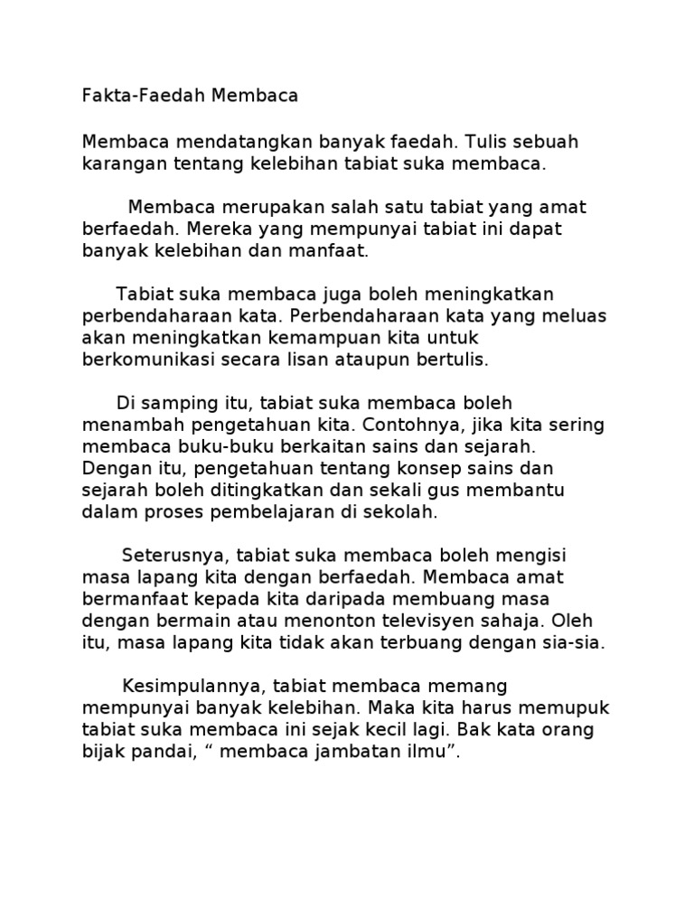 Membaca dapat memberikan pelbagai faedah kepada kita. Tuesday 4 september 2018. Hal ini dapat membantu mereka dalam menulis karangan yang baik. Membaca merupakan salah satu tabiat yang amat berfaedah.