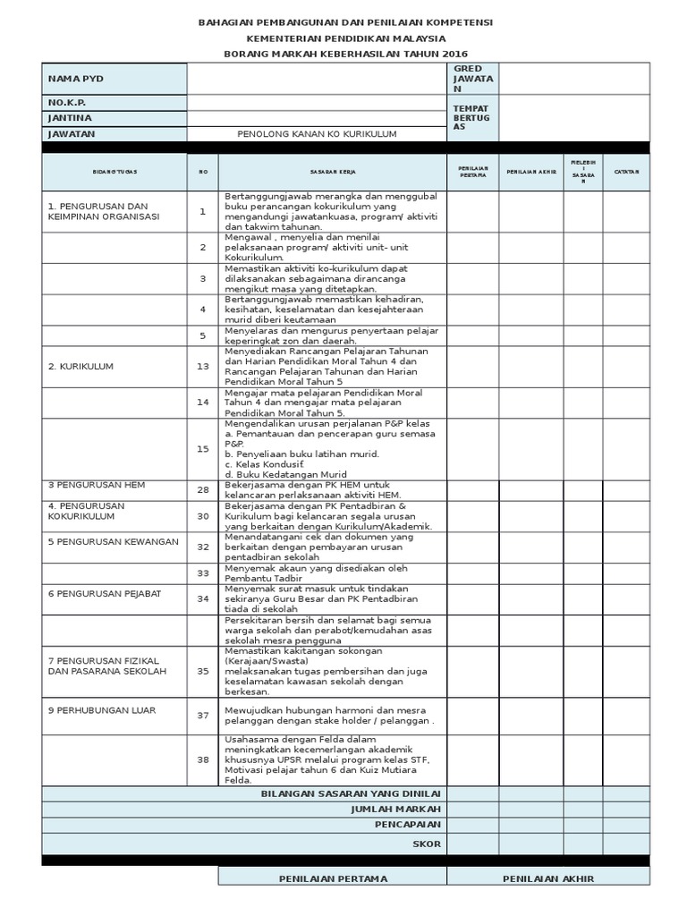 Contoh sasaran kerja tahunan guru penolong kanan kokurikulum. Penolong kanan hal ehwal murid 4. Penolong kanan kokurikulum 5. 2 1 1 bertanggungjawab merangka dan menggubal buku perancangan kokurikulum yang mengandungi jawatankuasa program aktiviti dan takwim tahunan. Muat turun di sini.