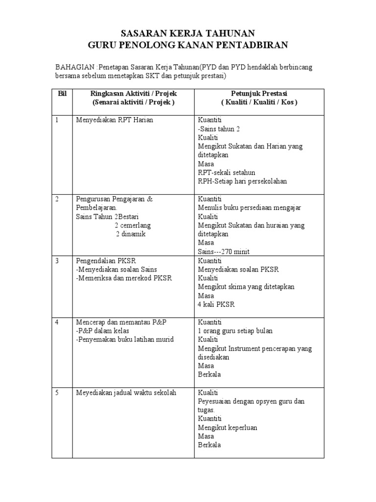 4 3 1 4 3 contoh borang sasaran kerja tahunan yang telah lengkap diisi adalah seperti di kembaran iii. Jadual hendaklah diserahkan kepada guru penolong kanan kokurikulum dalam tempoh dua minggu selepas sekolah bermula untuk semester pertama. Contoh sasaran kerja tahunan skt guru umum warga guru sedia maklum yang bermula tahun 2015 laporan penilaian prestasi tahunan lnpt akan dilaksanakan secara atas talian online oleh itu setiap guru perlu mempunyai sasaran kerja tahunan skt untuk melengkapkan pengisian lnpt atas talian ini. Contoh sasaran kerja tahunan gpk ko kurikulum lampiran 1 penetapan sasaran kerja tahunan 2012 nama.