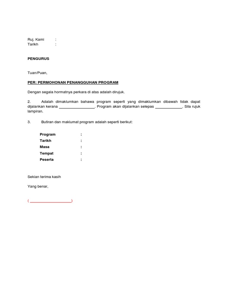 Contoh surat rasmi penangguhan tarikh program. 4 disember 2012 20 muharram 1434hkepada dr ibrahim bin hashim pengarah pusat islam universiti pendidikan sultan idriskampus sultan azlan shah proton city tanjung malim perak melalui nik muhamad shafiq nasren bin ismail pengarah program ceramah perdana rakan surau al. Malacca contoh surat rasmi permohonan penangguhan pembayaran yuran related posts to contoh surat rasmi penangguhan contoh surat rasmi penangguhan 2016 12 13t04 49 00 08 00 rating. Adalah dimaklumkan bahawa program seperti yang dimaklumkan dibawah tidak dapat dijalankan kerana. Results for contoh surat rasmi penangguhan program translation from malay to english.