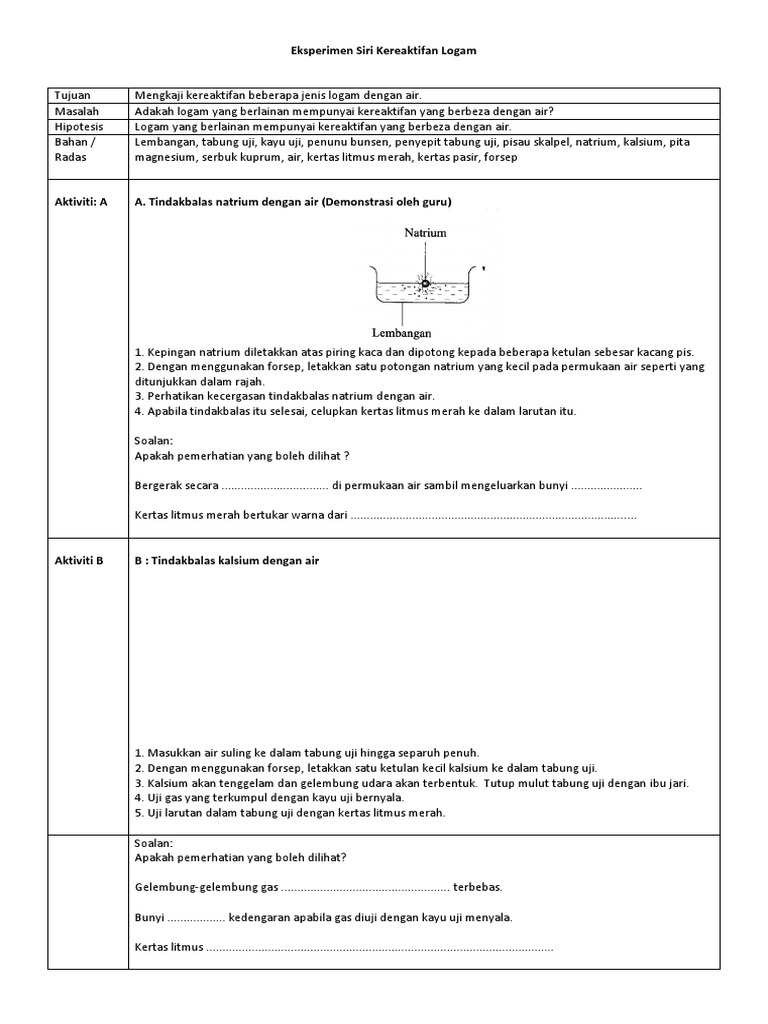 Eksperimen sains tingkatan 3 bab 4 kereaktifan logam. Sains tingkatan 3 bab 4 kereaktifan logam. Rajah menunjukkan eksperimen bagi mengkaji tindak balas logam dan oksigen. Mengkaji kereaktifan tindakbalas jenis logam dengan asid. Dalam siri kereaktifan logam skl logam logam disusun mengikut kereaktifan tindak balasnya terhadap oksigen bagi membentuk oksida logam.