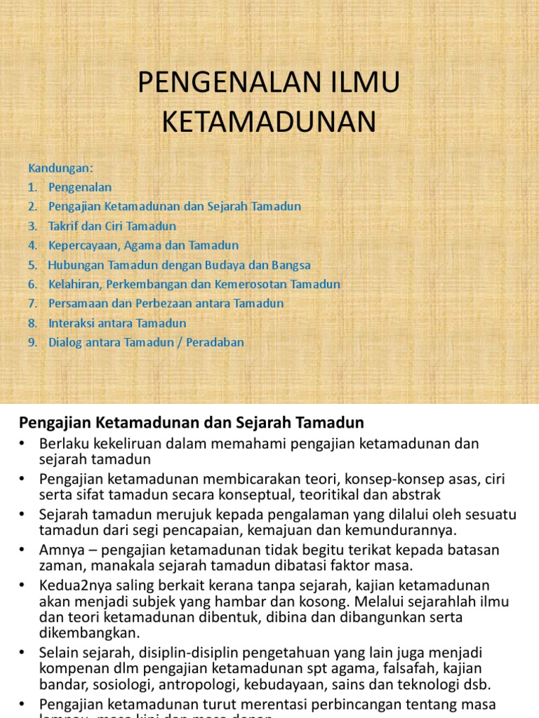 Taylor ahli antropologi pula menyamakan istilah tamadun dengan budaya sebagai suatu yang merangkumi makna keseluruhan pencapaian manusia termasuk pengetahuan kepercayaan seni moral undang undang adat dan keupayaan keupayaan serta tabiat tabiat lain yang didapati oleh manusia sebagai anggota masyarakat. Mengetahui konsep dan ciri ciri ketamadunan 2. Ilmu ketamadunan ciri2 ketamadunan faktor kemorosotan tamadun faktor kemuculan tamadun tamadun secara tipologi sarjana barat interaksi antara tamadun sejarah ketamadunan pengajian tamadun pencapaian pmbangunan dlm segala perlakuan pemikiran kemajuan yg tinggi. Hubungan antara tamadun dengan bangsa tidaklah begitu ketara sekalipun terdapat beberapa tamadun yang sering dikaitkan dengan sesebuah bangsa seperti tamadun cina dan tamadun india.