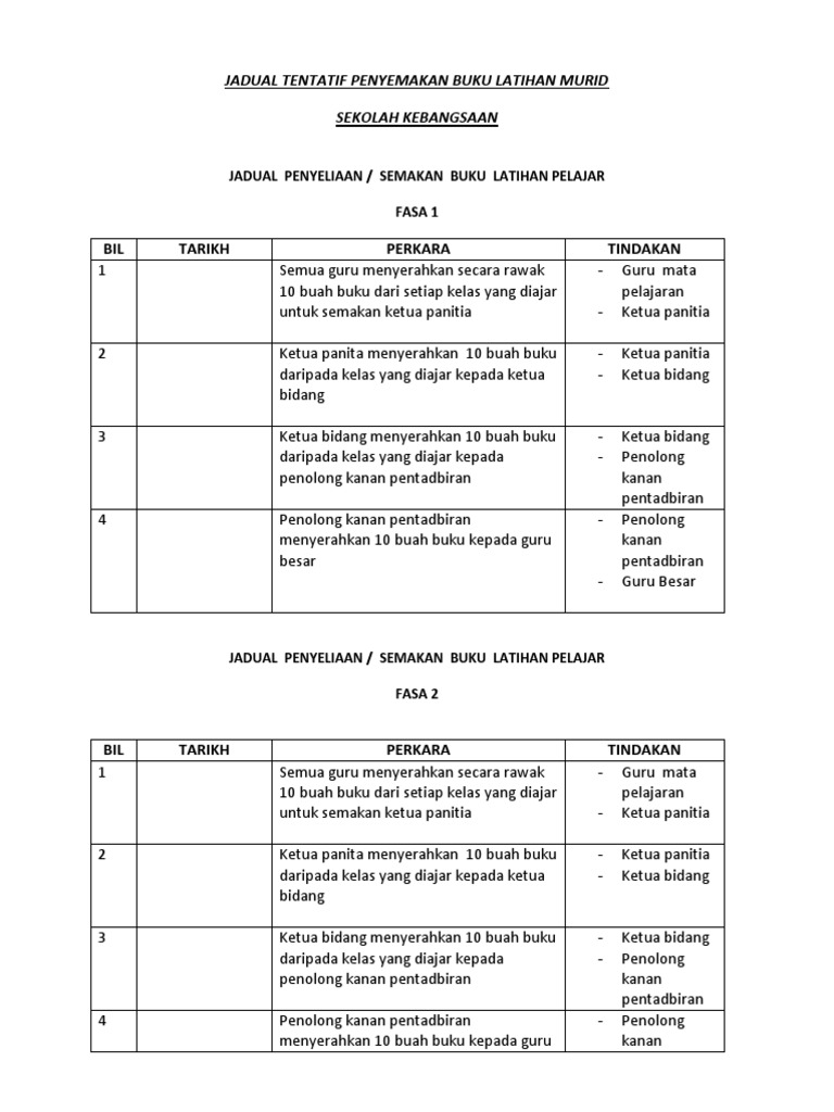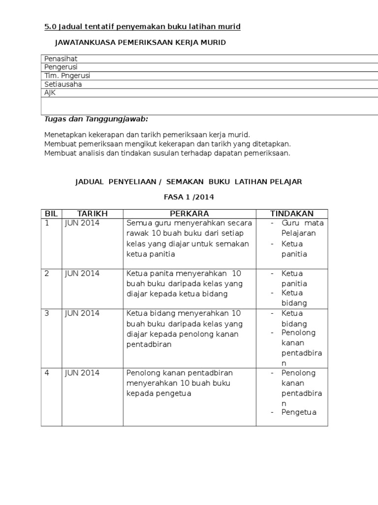 Carta alir semakan hasil kerja murid mula makluman kepada guru jadual semakan hasil kerja murid menanda hasil kerja murid member ulasa membina bimbingan guru penyediaan jadual pemantauan pengumpulan buku dan pengisian borong menghantar buku kepada pentadbir pengesahan. Jadual semakan buku latihan murid oleh pentadbir minggu 13 14 15 16 18 cat a tan. Rekod penyemakan buku latihan spsk pk06 01 via mysmks7physics blogspot my. Semoga bermanfaat kepada guru.