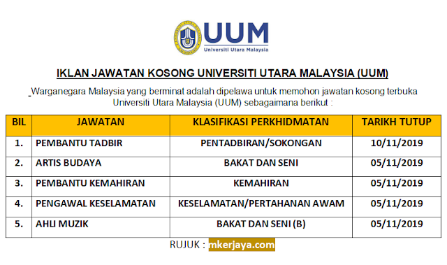 10 november 2019 ahad hanya calon yang layak selepas tapisan sahaja yang akan dipanggil untuk ditemu duga. Jawatan kosong 2019 di universiti utara malaysia uum permohonan adalah dipelawa daripada warganegara malaysia yang berkelayakan dan berumur tidak kurang dari 18 tahun pada tarikh tutup iklan ditawarkan untuk memohon jawatan kosong di universiti utara malaysia uum. Jawatan kosong di universiti utara malaysia uum dengan ini mempelawa warganegara malaysia yang berkelayakan dan berumur tidak kurang daripada 18 tahun pada tarikh tutup iklan jawatan untuk memohon jawatan seperti senarai dibawah kepada sesiapa yang berminat bekerja di sektor kerajaan dan swasta yang berkelayakan dipelawa untuk memohon sekarang juga iaitu. Sila penuhkan maklumat peribadi akademik pengalaman dan lain lain mengikut menu yang disediakan.