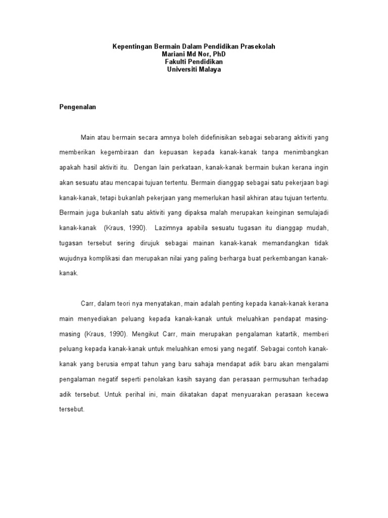 Kepentingan pendidikan awal kanak kanak. Abstrak pendidikan awal anak adalah peletakan batu asas yang penting supaya keseluruhan sistem pendidikannya bergerak pada orbit yang betul berpaksikan prinsip tauhid. Ramai pakar kanak kanak yang bersetuju bahawa dengan menyertai pusat pendidikan awal kanak kanak akan menyediakan mereka untuk ke tadika dan sekolah. Psikologi pendidikan juga menekankan pada peringkat prasekolah usia 4 hingga 6 tahun kanak kanak belajar mengenai peranan mengikut jantina misalnya kanak kanak perempuan akan meniru peranan ibunya seperti memasak membasuh kain mengemas rumah dan sebagainya kanak kanak juga berkawan dan bermain dengan kanak kanak lain yang berada disekitar rumahnya kanak kanak juga terlibat dalam permainan. Kebaikan pendidikan awal kepada kanak kanak kanak kanak ibarat kain putih yang perlu dicorakkan oleh ibu bapa supaya menjadi pelapis generasi negara.