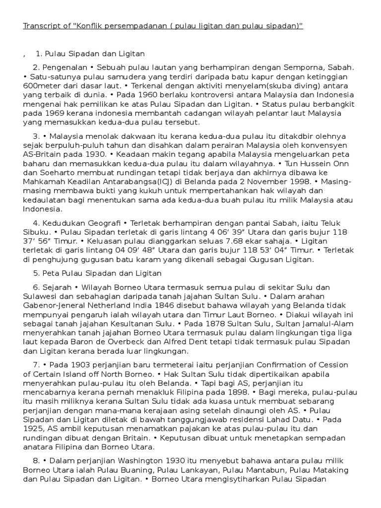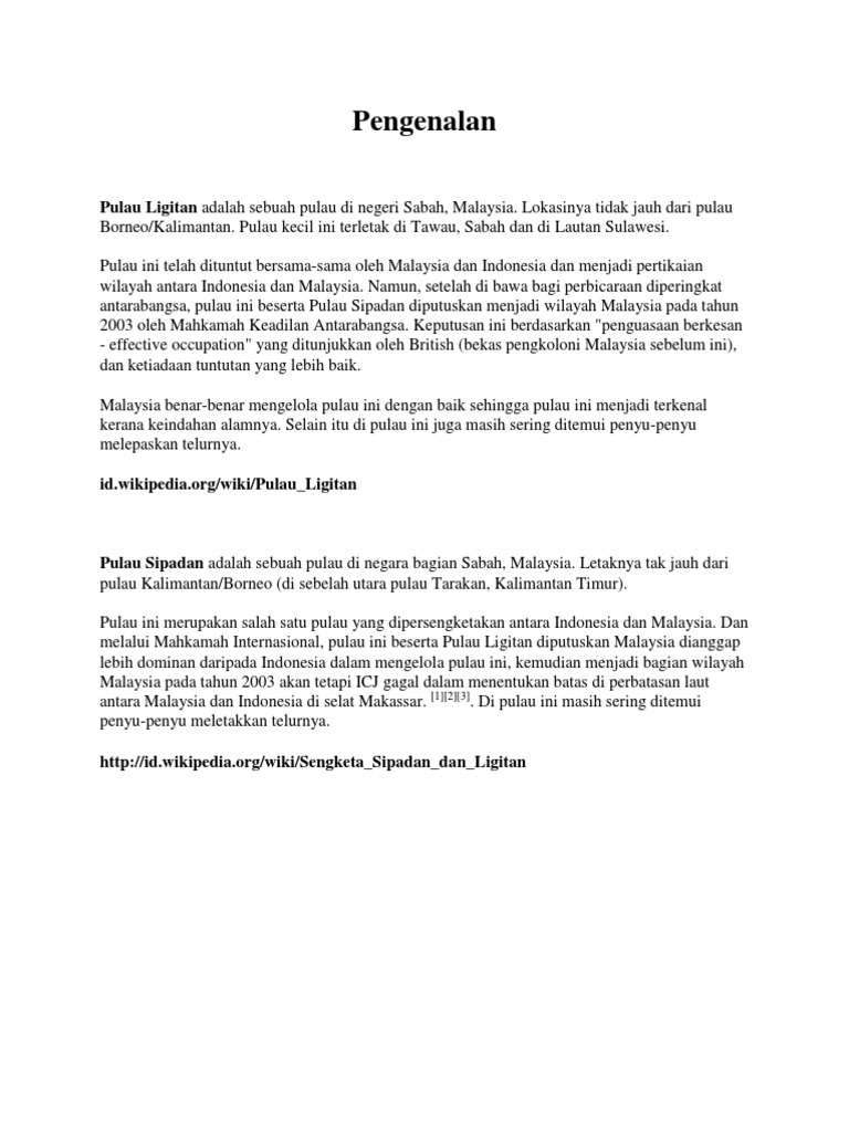 Konflik persempadanan pulau ligitan dan pulau sipadan 1. 2 0 isu konflik persempadanan dan tuntutan bertindih antara malaysia dengan indonesia 2 1 latar belakang pertikaian pulau sipadan dan ligitan merupakan pertikaian wilayah antara indonesia dan malaysia di atas dua pulau di laut sulawesi iaitu pulau ligitan dan sipadan. Pertikaian pulau ligitan dan sipadan 2002 icj 3 merupakan pertikaian wilayah antara indonesia dan malaysia di atas dua pulau di laut sulawesi iaitu pulau ligitan dan sipadan pertikaian itu bermula pada 1969 dan sebahagian besarnya diselesaikan oleh mahkamah keadilan antarabangsa icj pada tahun 2002 yang berpendapat bahawa kedua pulau tersebut adalah milik malaysia. Pengenalan sebuah pulau lautan yang berhampiran dengan semporna sabah.