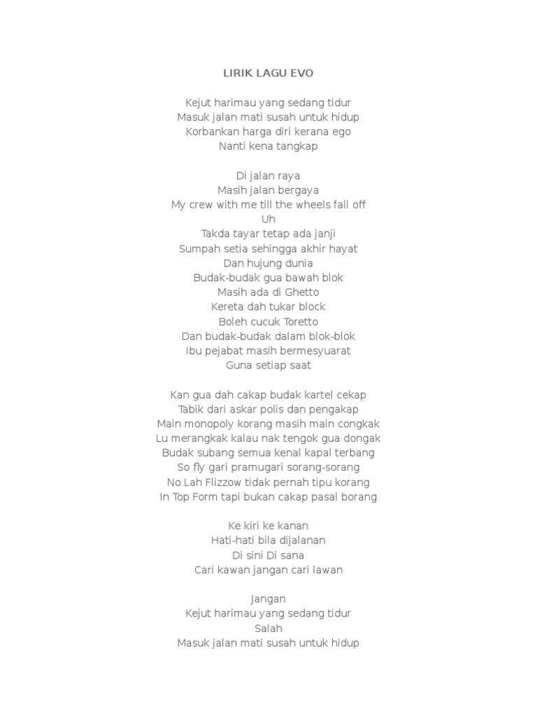 Lagu polis evo 2 lirik. Chorus kalau ku diseru pasti datang sang saka biru kami akan menang. Evo ost polis evo by joe flizzow ft sonaone kejut harimau yang sedang tidur masuk jalan mati susah untuk hidup korbankan harga diri kerana ego nanti kena tangkap aha di jalan raya masih jalan bergaya my crew with me till the wheels fall off uh takde tayar tetap ada janji sumpah setia hingga akhir hayat dan hujung dunia. Polis entry want to jaga bila lu nampak lampu waja cuak better run to mama ke kiri ke kanan hati hati bila di jalanan di sini di sana cari kawan jangan cari lawan jangan kejut harimau yang sedang tidur salah masuk jalan mati susah untuk hidup jangan korbankan harga diri kerana ego salah nanti kena tangkap dengan polis evo evo evo jangan kejut. Altimet s verse uhhh kerah semua unit rendezvous bertemu di markas sulit kita senangkan semua kes rumit.