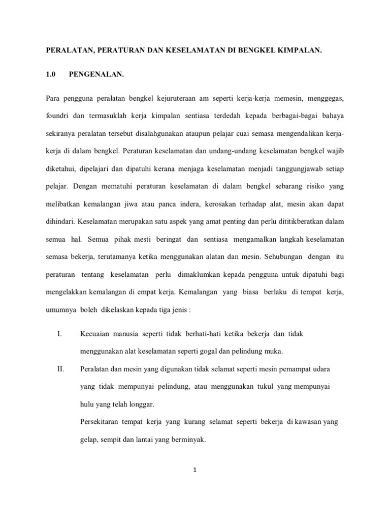 Sebelum memasuki bengkel kita perlu mengetahui tentang keselamtan di dalam bengkel tersebut. Semasa melakukan kerja kerja kimpalan kita perlu memakai alat pelindung mata. Keselamatan diri dan keselamatan alatan perlulah dipatuhi. Keselamatan bengkel keselamatan diri 1memakai pakaiankeselamatan yangdapat melindungidaripada cahayadan habukmerbahaya simbol 7.