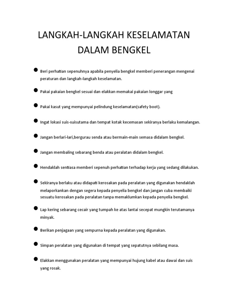Gunakan kasut yang bertutup dan bertapak getah semasa bekerja di dalam bengkel. Langkah yang perlu diambil untuk menjaga keselamatan dalam bengkel. Peraturan di bengkel kimpalan peraturan keselamatan untuk melakukan kimpalan dan alat oxy acetylene sebelum melakukan kerja kimpalan pemeterian pemotongan dan pemanasan dengan menggunakan mesin kimpal atau alat oxy acetylene anda dikehendaki untuk mendapatkan kebenaran daripada pegawai anda dengan mengisi borang hot work permit. Di peringkat awal tenaga pengajar akan menerangkan peraturan keselamatan kepada pelajar.