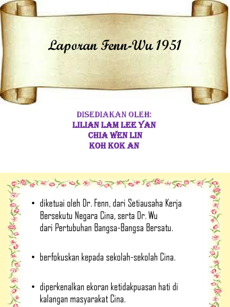 Riduan bin zaharigb100070 laporan fenn wu ogos 1951 1 lporan barn slideshare uses cookies to improve functionality and performance and to provide you with relevant advertising. If you continue browsing the site you agree to the use of cookies on this website. Laporan fenn wu 1951 sekolah vernakular cina sejarah sejarah laporan fenn wu 1951 ini tercetus daripada reaksi ketidakpuashatian kaum cina terhadap laporan barnes 1950. Laporan fenn wu 1951 diadakan sebagai reaksi tidak puas hari masyarakat cina terhadap laporan barnes 1950.