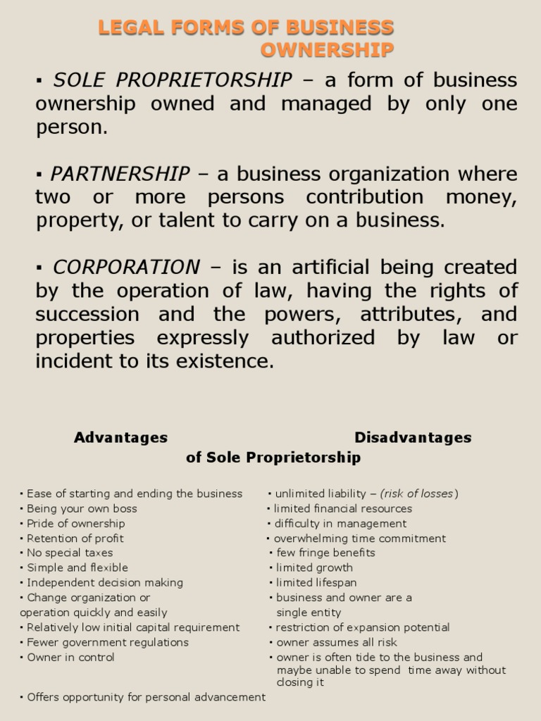 Choosing legal forms of business. 2 describe the sole proprietorship and partnership forms of organization and specify the advantages and disadvantages. This decision will have long term implications so consult with an accountant and attorney to help you select the form of ownership that is right for you. If you need help with a form of ownership business plan you can post your legal need on upcounsel s marketplace.