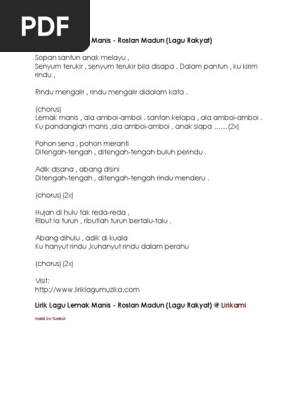 Lirik lagu rakyat pahang lemak manis. Info tentang penyanyi lagu rakyat roslan madun anda boleh layari pahang community tweet posted by. Ahad oktober 17 2010. Chorus 2x lemak manis alah amboi amboi santan kelapa alah amboi amboi ku pandanglah manis alah amboi amboi anak siapa. Zaza memang suka dengar radio.