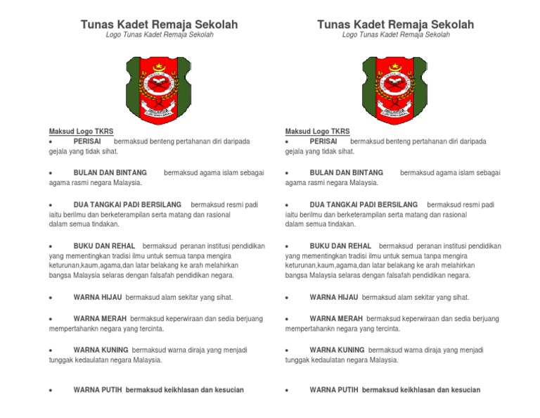 Tunas kadet remaja sekolah tkrs grade level. Malaysia islam boys cadet corps and its membership was open to sm raja abdullah islam students association it had only 20 members in the beginning consisting of form 1 and form 2 students only. Tunas muda remaja yang masih boleh dibentuk. Lihat logo di atas dan cuba fahami maksud yang tersirat padanya.