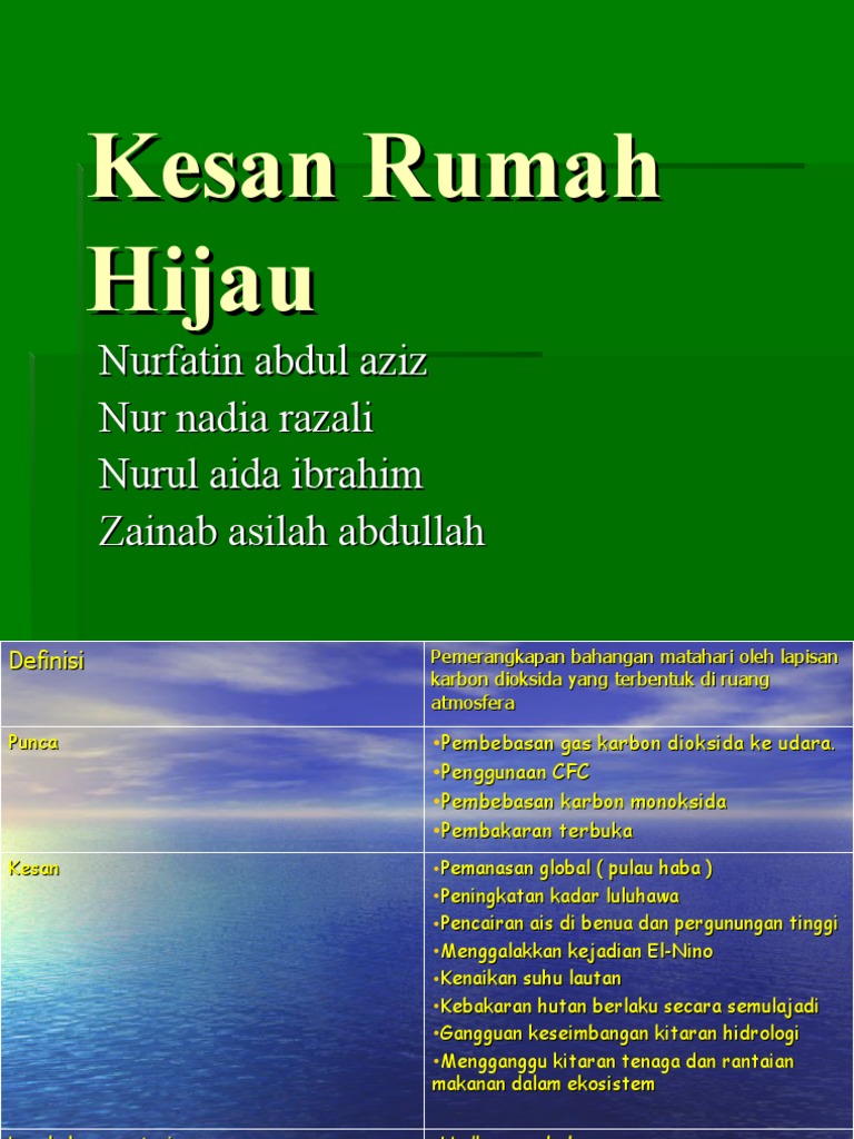 Mengakibatkan fenomena jerebu d peranan atmosfera 1. Kesan rumah hijau dan penipisan lapisan ozon merupakan dua fenomena yang berbeza tetapi memberikan dampak yang sama ke atas alam sekitar fizikalnya. Konsep kesan rumah hijau merupakan fenomena yang berkait rapat dengan pemanasan global pembebasan gas karbon dioksida secara berleluasa menjadi punca utama berlakunya kesan rumah hijau cahaya matahari membawa sinaran ultraungu ke bumi tetapi haba yang sampai ke permukaan bumi tidak dapat dibebaskan akibat disekat olah gas karbon dioksida yang meliputi atmosfera. Kesan ini tidak tertakluk pada pemanasan global sahaja tetapi juga di dalam mana mana ruang.