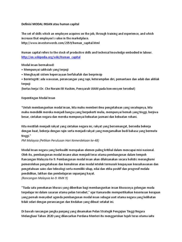 Maksud pembangunan modal insan. Golongan manusia yang boleh dikategorikan sebagai modal insan adalah dari golongan anak anak kecil sehinggalah para pelajar di institusi pengajian tinggi. Apa itu modal insan. Ketersediaan tenaga kerja berkemahiran tinggi adalah penting untuk menyokong peralihan semua sektor ekonomi ke arah aktiviti berintensifkan pengetahuan teknologi dan inovasi. Malah konsep pembangunan modal insan yang diutarakan oleh yab perdana menteri memperlihatkan satu agenda kerajaan dalam usaha meningkat dan memperkukuhkan jati diri rakyat dalam segenap lapangan hidup.