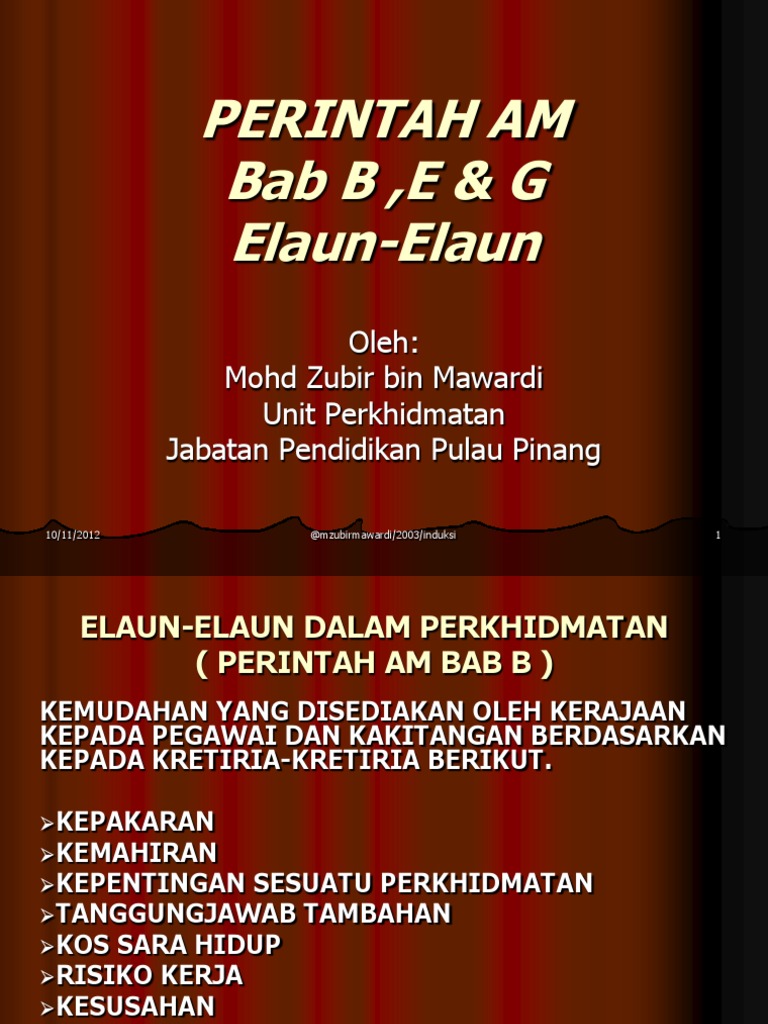 9 tahun 1991 membenarkan seorang pengiring jika diperakukan oleh pegawai perubatan tempatan. Perkhidmatan bil 4 2002 elaun dan imbuhan dalam perkhidmatan awam berdasarkan perintan am bab b merupakan satu keistimewaan dan bukan bersifat kekal yang patut dibayar kepada pegawai berkelayakan berdasarkan syarat dan kadar yang ditetapkan. Perintah am bab b pendahuluan. Perintah am bab b elaun elaun dalam perkhidmatan.