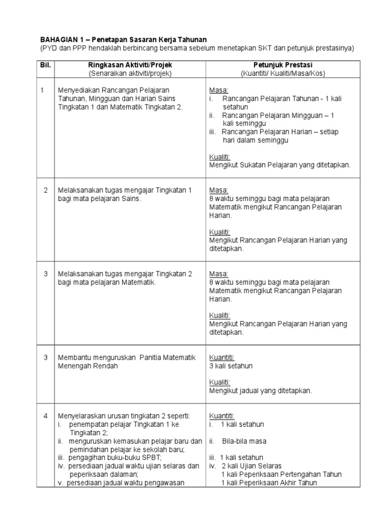 Pyd dan ppp hendaklah berbincang bersama sebelum menetapkan skt dan penunjuk pretasinya bil 1. Kelab bola tampar c. Senarai tugas utama dan sasaran kerja tahunan hendaklah diisi oleh pegawai yang dinilai selepas berbincang dengan pegawai penilai sasaran kerja tahunan bagi sesuatu tahun hendaklah ditentukan pada bulan januari tahun penilaian. Secara umumnya tugas dan tanggungjawab guru penyelaras spbt adalah seperti yang berikut.