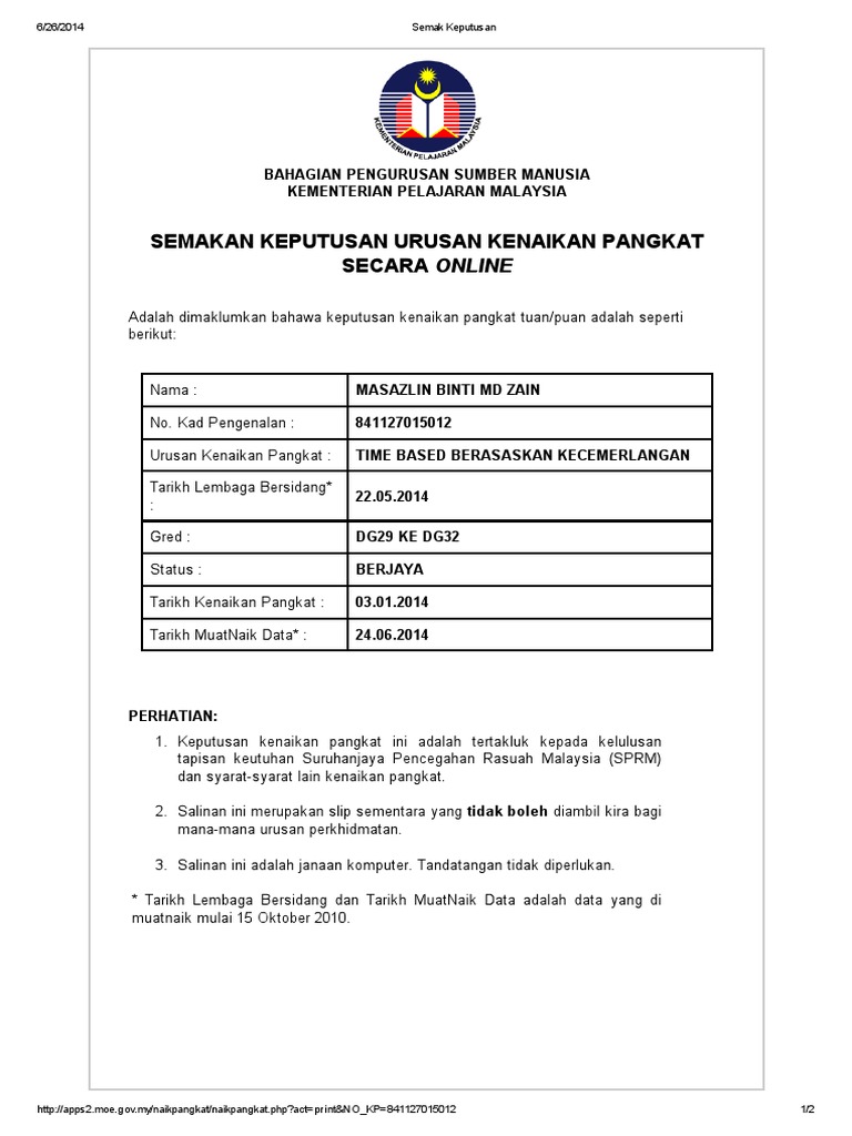 Urusan pemangkuan dan kenaikan pangkat semakan online pendidikan ppp dan anggota 8 tahun pangkat kpm epangkat kpm kementerian pendidikan malaysia sistem kenaikan pangkat kementerian pelajaran malaysia kpm pangkat bagi. Semakan atas talian ini melibatkan semakan keputusan. Pemohon atau pengguna tidak dibenarkan lagi membuat sebarang urusan pendaftaran. Urusan kenaikan pangkat secara time based berasaskan kecemerlangan dilaksanakan secara berperingkat mengikut tempoh perkhidmatan yang melayakkan dan perakuan oleh ketua jabatan.