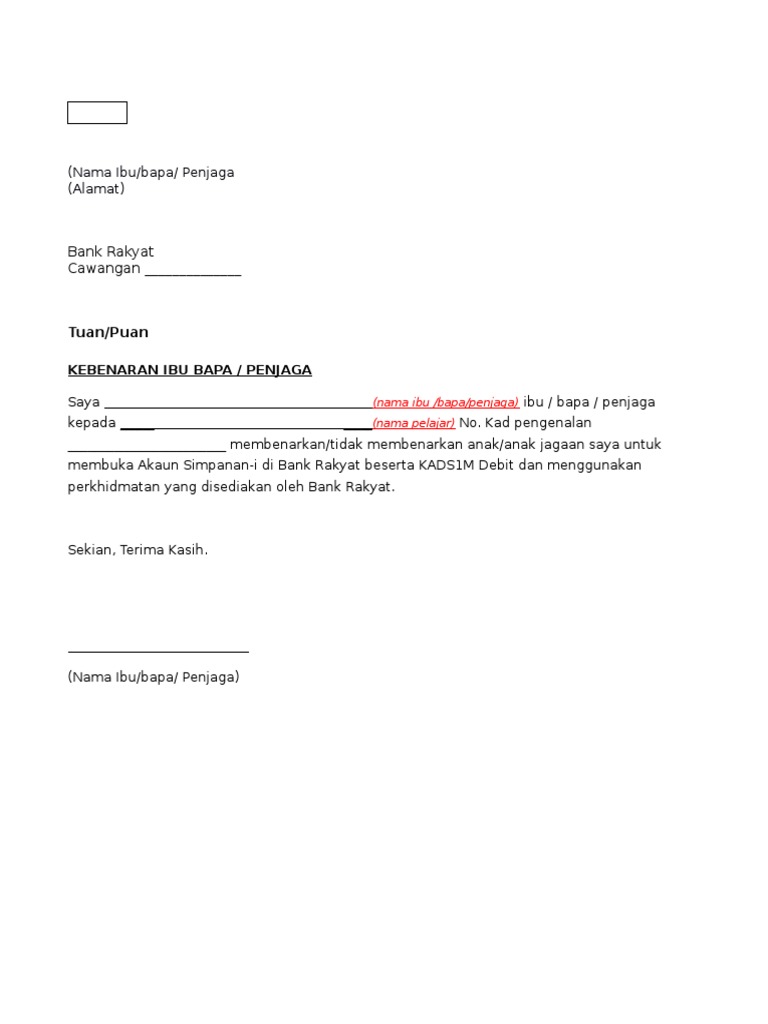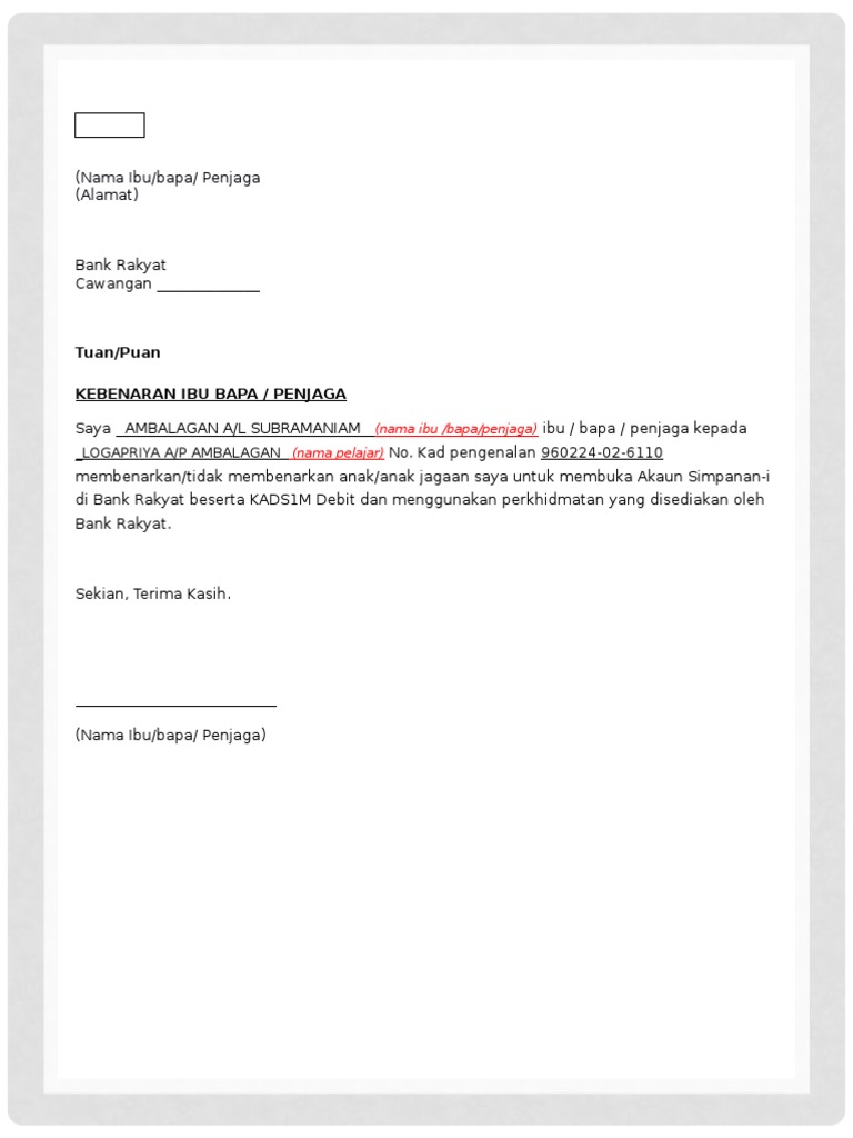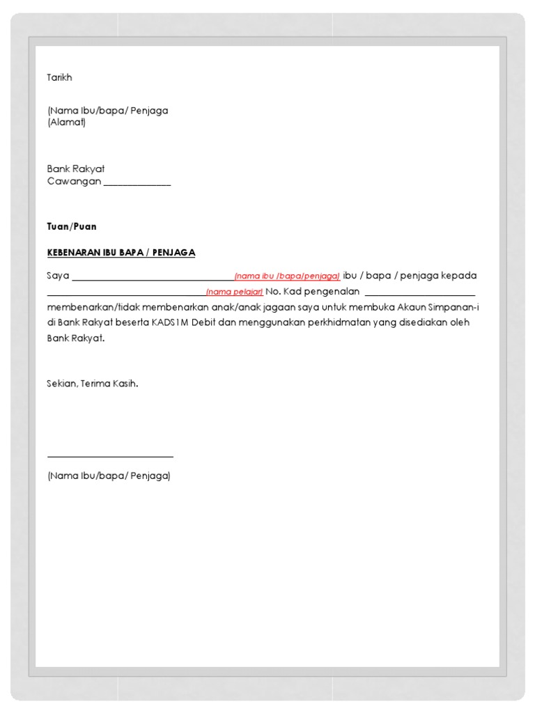 Surat akuan pengesahan pendapatan saya. Ibu bapa penjaga. Pdf contoh surat kebenaran membuka akaun simpanan i di bank rakyat beserta kads1m debit docx 359 kb. Starting october 13 items will be automatically deleted forever after they ve been in your trash for 30 days.